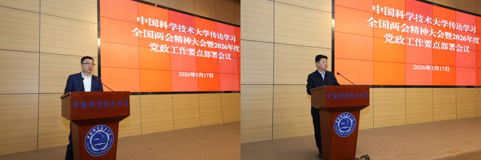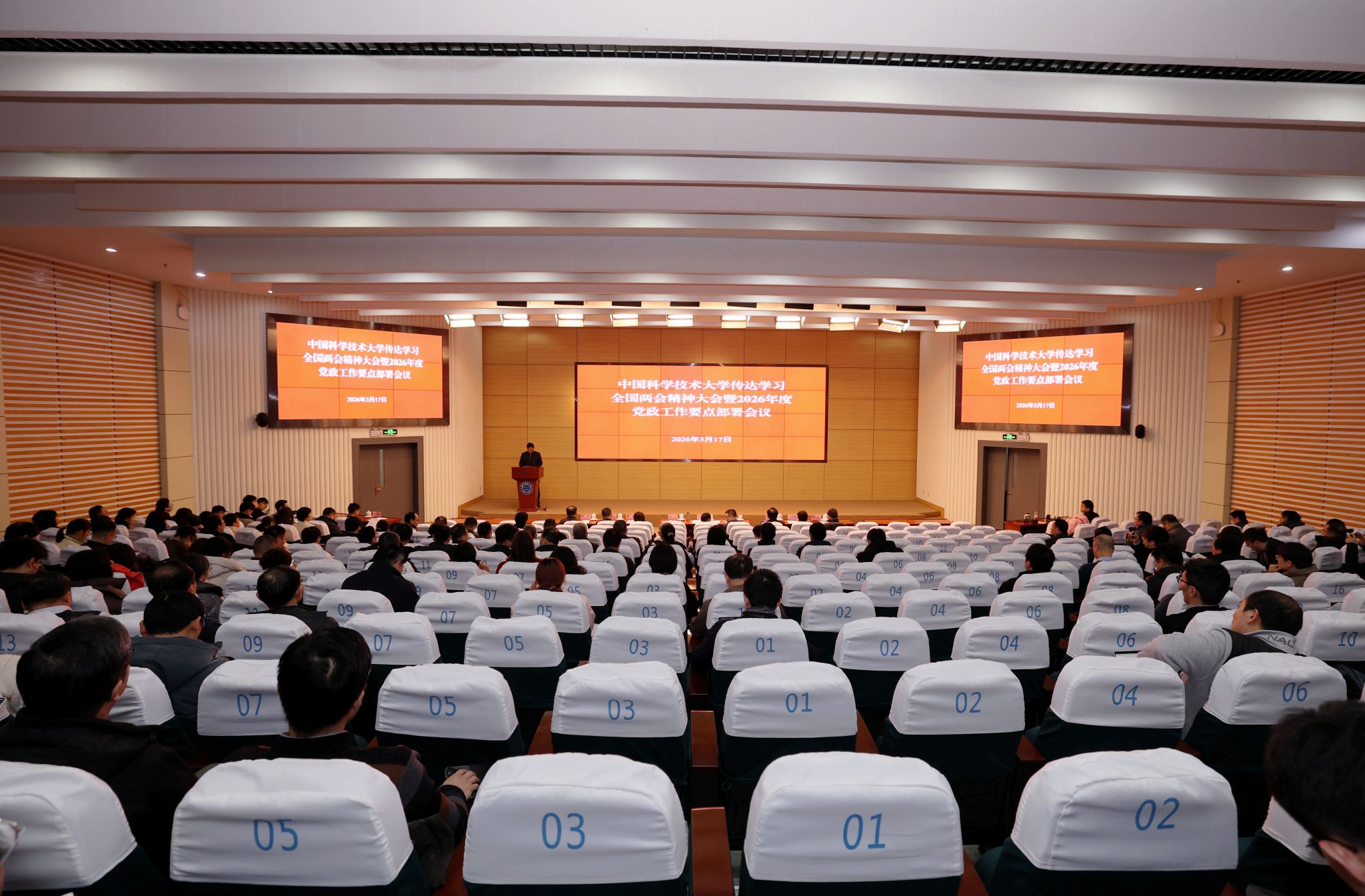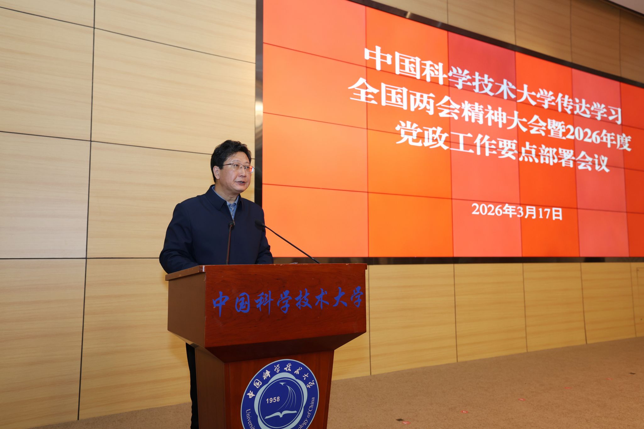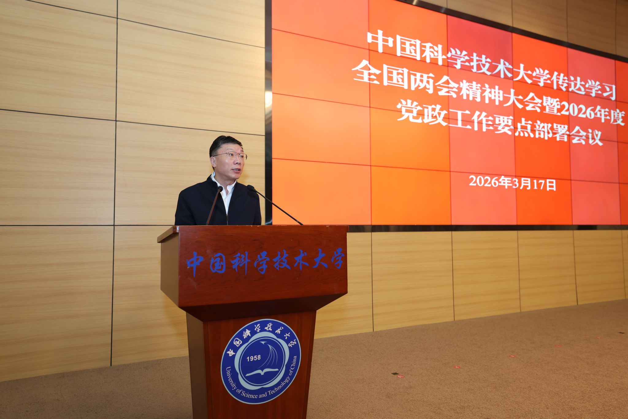 3月17日上午,中国科学技术大学传达学习全国两会精神大会暨2026年度党政工作要点部署会议在东区理化大楼东三报告厅举行。校长、党委副书记常进等在校校领导,两院院士,校党委、纪委委员,全体中层干部,各民主党派负责人,离退休党员干部代表,教师代表,学生代表参加。会议由校党委常务副书记蒋一主持。