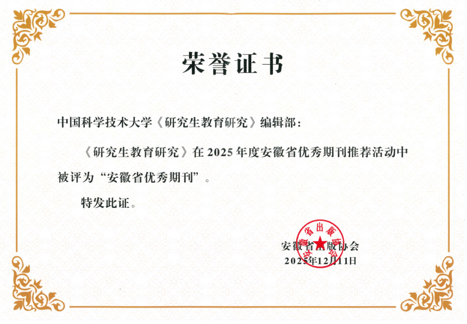 《研究生教育研究》是由学校和中国学位与研究生教育学会共同主办的高端教育类学术期刊,是中国学位与研究生教育学会会刊,现已同时入选我国人文社会科学领域“四大核心”。期刊曾于2017年、2021年分别获评“华东地区优秀期刊”“安徽省优秀期刊”。此次,本刊同时获此两项荣誉,既是相关组织和部门对期刊质量、办刊特色、学术水平与社会影响的高度肯定,也是激励期刊不断创新办刊发展思路、持续提升学术出版质量的重要动力。