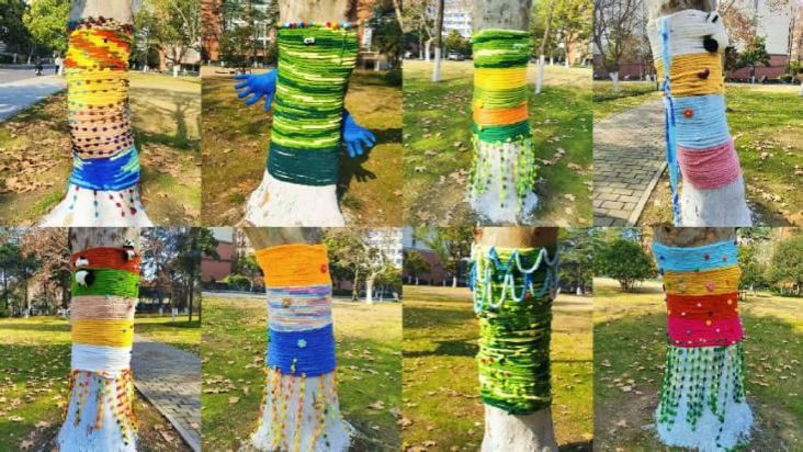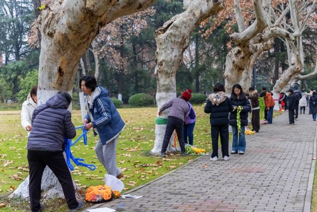 活动中,代际互动温情满满。老同志们布满岁月痕迹的双手与青年学子充满活力的双手默契配合,缠绕、打结、装饰等一系列动作有条不紊,草坪上不时响起欢声笑语。原本光秃的梧桐树干逐步被色彩艳丽、样式多样的“冬装”包裹,不仅有效提升了树木防寒能力,更成为校园内独具特色的创意景观,吸引众多师生驻足打卡。