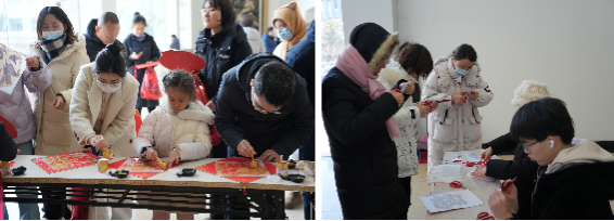 活动现场年味浓郁,气氛热烈,设有春联书写区、拓印体验区与窗花展示区。长桌铺展,红纸、笔墨齐备,教职工书画协会的老师们挥毫泼墨,笔走龙蛇,“蹄声催晓迎新岁,骏骨凌云展壮图”等一副副寓意吉祥的春联跃然纸上,将美好的新春祝愿融入墨香之中。窗花展示区内摆放着各式的剪纸作品,吸引师生驻足观赏,感受传统剪纸技艺精巧与灵动的魅力。在拓印体验区前,师生亲手拓印“福”“马年大吉”等字样图案,体验非遗技艺,制作专属的节日纪念。