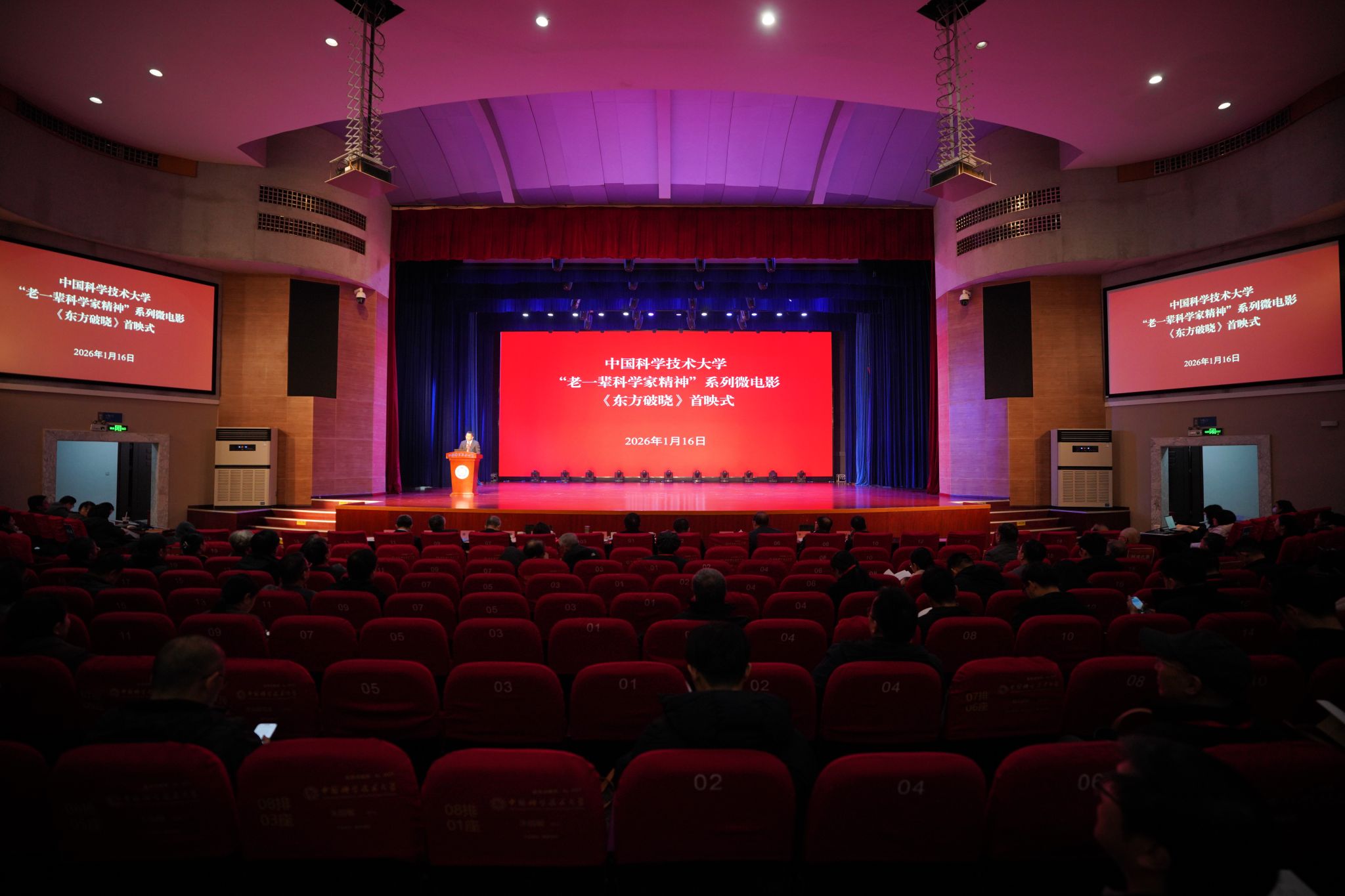会上还举行了微电影《东方破晓》的首映式。《东方破晓》讲述了赵九章先生的感人事迹,赵九章是我国人造卫星事业的奠基者和开拓者、“两弹一星功勋奖章”获得者,于1958年创建了中国科大应用地球物理系并担任首任系主任。《东方破晓》是学校联合新华社安徽分社、新华网制作的第八部“老一辈科学家精神”系列微电影。