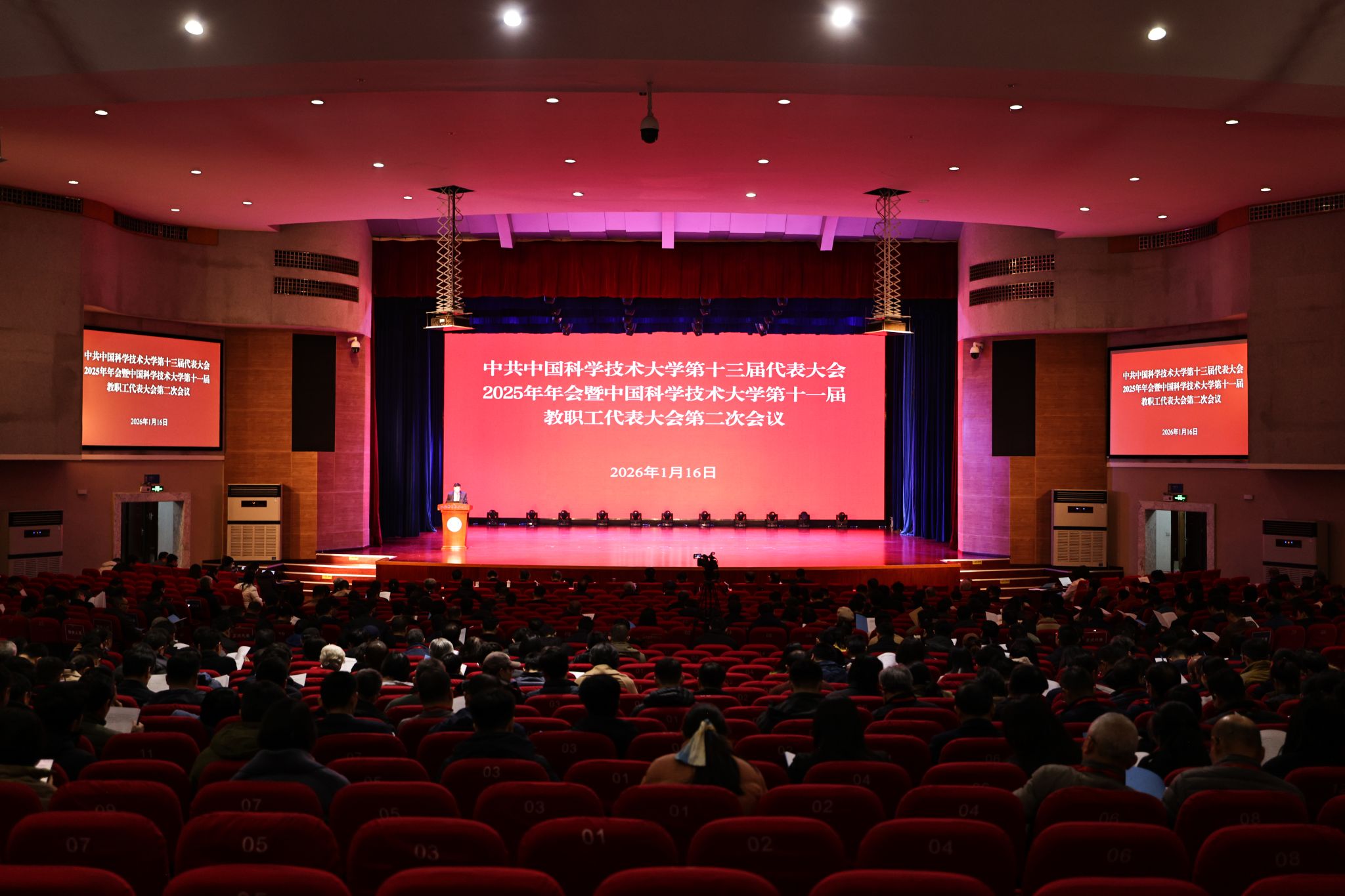 1月16日上午,中共中国科学技术大学第十三届代表大会2025年年会暨中国科学技术大学第十一届教职工代表大会第二次会议(以下简称“两代会”)在东区大礼堂开幕。校党委书记舒歌群,校长、党委副书记常进等在校校领导出席并在前排就座,大会常务主席、校党委副书记周丛照主持会议。“两代会”正式代表、特邀代表和列席代表出席大会。