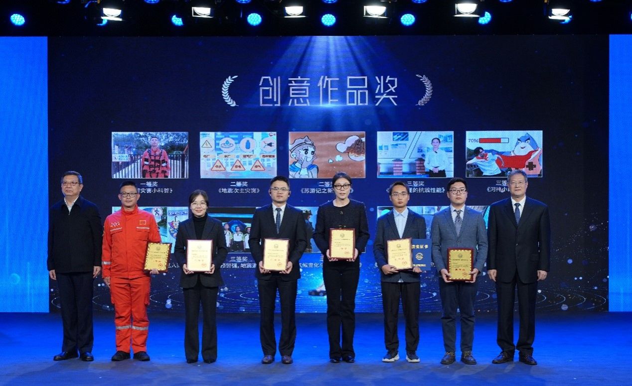 首届应急减灾与安全科普短视频大赛颁奖现场(右三为视频创作团队负责人黄林)