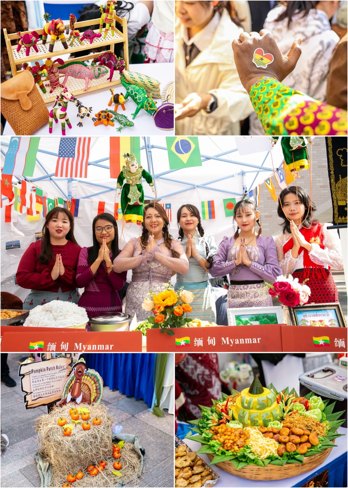 活动现场,各国文化展位人头攒动、热闹非凡。国际学生们以美食、服饰、语言、游戏为媒介,全方位展现本国文化魅力:特色饮食香气四溢,传统服饰亮眼吸睛,互动问答与趣味游戏妙趣横生,民族歌舞活力四射,多样体验形式让现场氛围持续升温。师生们穿梭于各个展位,在沉浸式互动中感受不同文化的独特风情,进一步增进了彼此的文化理解与情感共鸣。